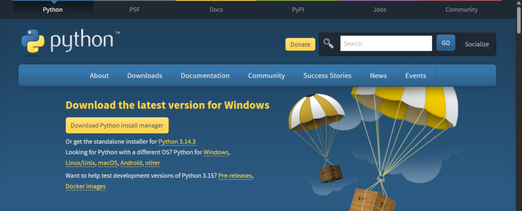 Python is a programming language and for writing code in python, first we need to setup python. The first step in Python for beginnersis setting up right tools on your computer. Next step in Python for beginners is to install Python itself in your computer. To do that, just open any browser on your computer and search Python and just download it or click here.